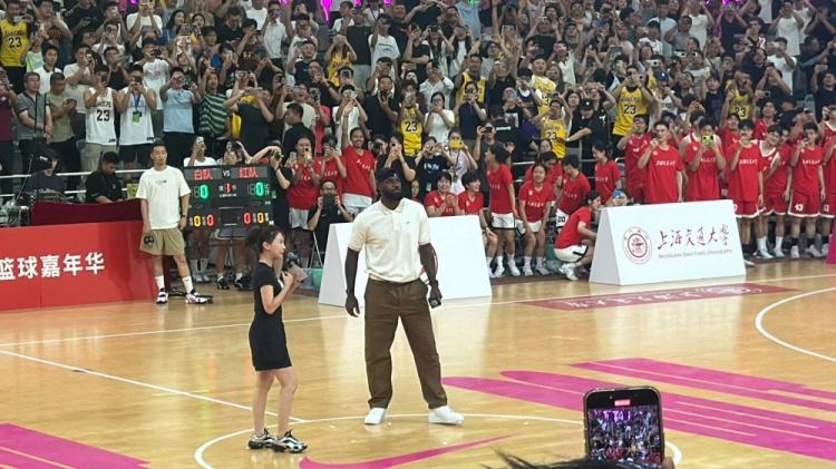 据“东方体育日报”抖音号、“詹姆斯吧官方微博”、小红书用户“篮球摄手虎”等媒体的报道,詹姆斯到场后向现场球迷招手问好,并帮助场上交大学生的比分完成跳球。